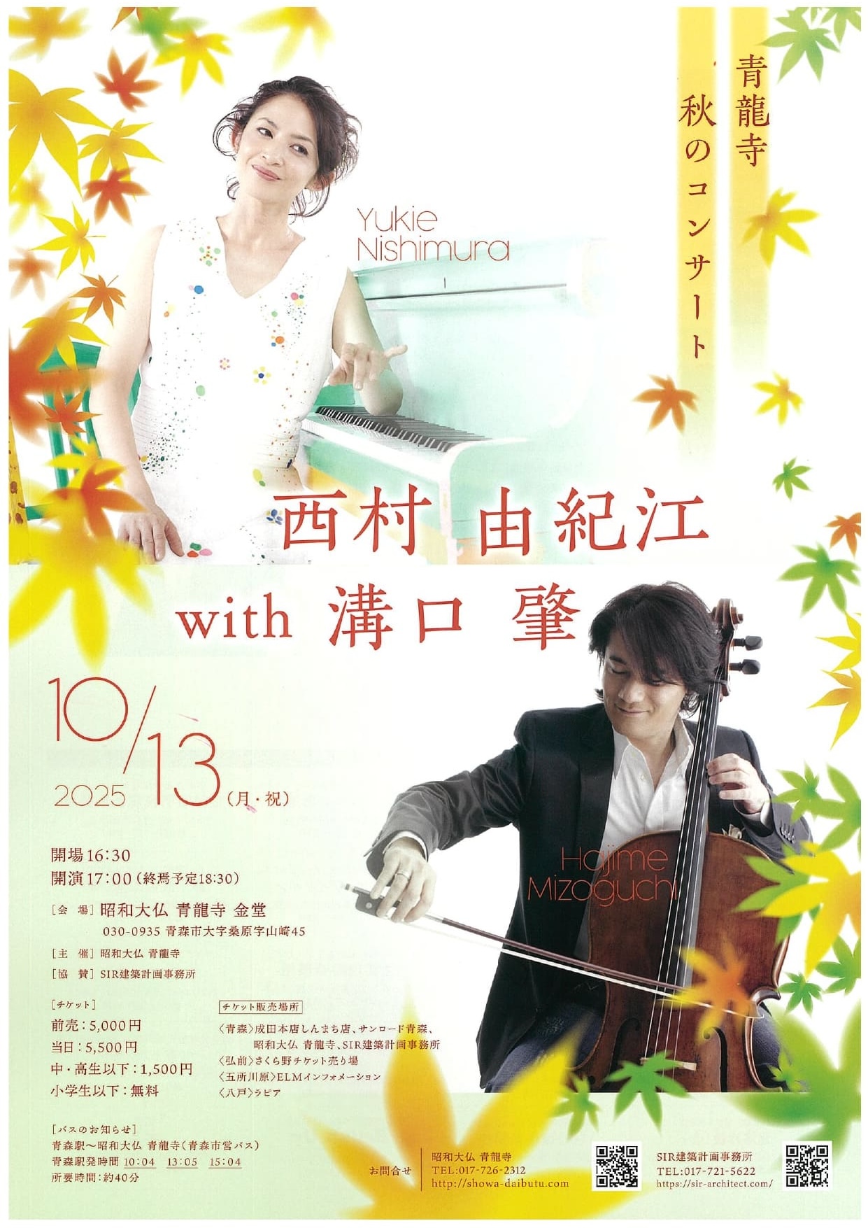 音楽で楽しい街に!企画しています。 20230930 西村 由紀江 with ウェイウェイ・ウー in 昭和大仏 青龍寺 SMILE WINDOW -愛のある家族へ- FM青森 SMILE WINDOW -愛のある家族へ- 20210911 西村 由紀江 2VOICE(原順子・叶央介)in 昭和大仏 青龍寺 20191005 MASAYOピアノデュオ 青森八甲ライオンズ結成55周年ライブ 20190921 西村 由紀江 ピアノコンサート 1 20190721 David Mathews with friends 20190622 MASAYOラテントリオ2019 1 20180908 MASAYO&ギターデュオ 20180217 西村 由紀江 絵画とピアノの調べ 20240925 西村 由紀江 ピアノコンサート 20250816 MASAYO wihe 折重由美子・関根彰良 20251013 西村 由紀江 with 溝口 肇